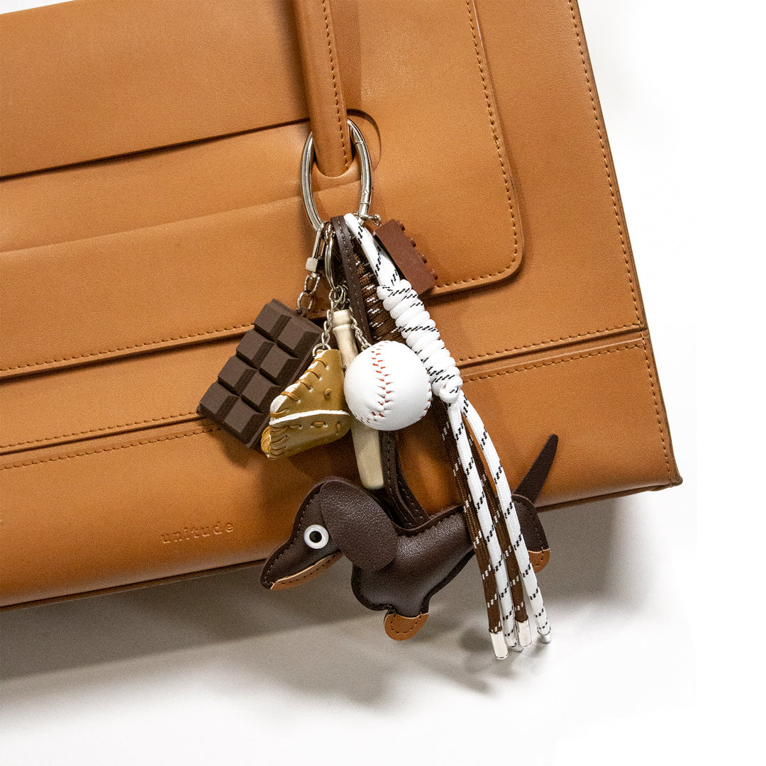 • Crafted from premium leather, it features a cute dachshund design along with fun details like a baseball, bat, and chocolate bar. Perfect for attaching to your bag or keys, this keychain combines whimsy and elegance for a unique, stylish touch.